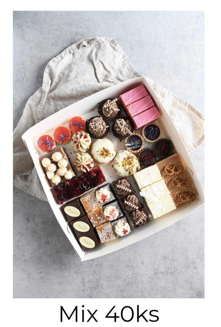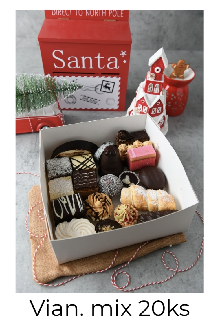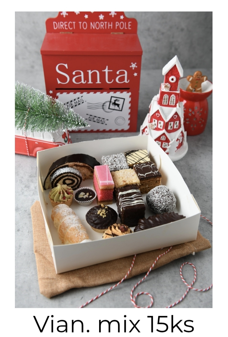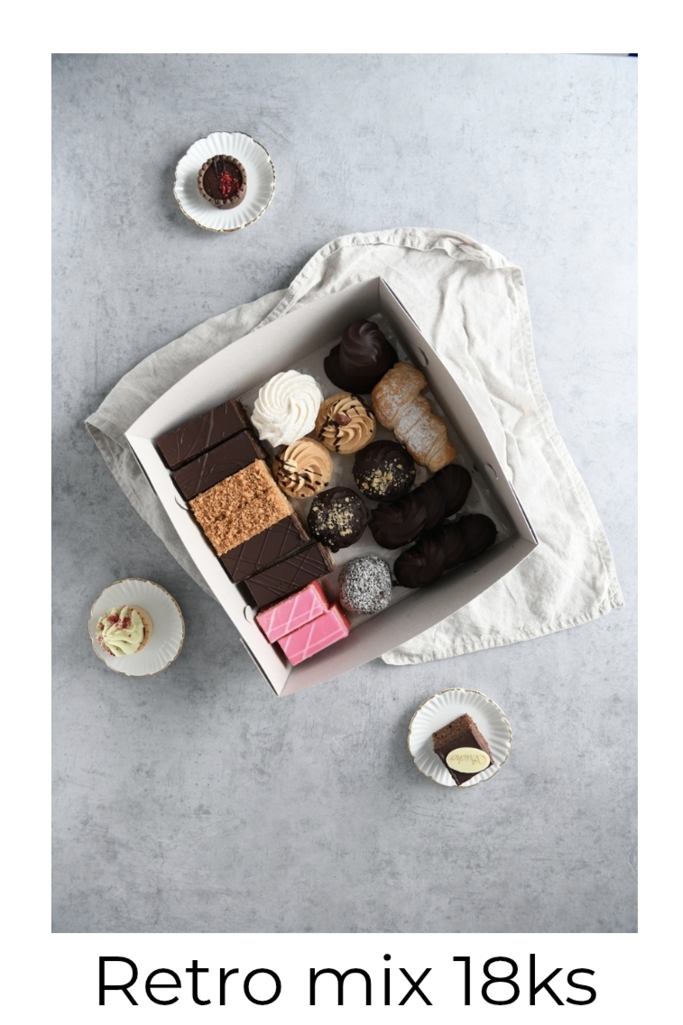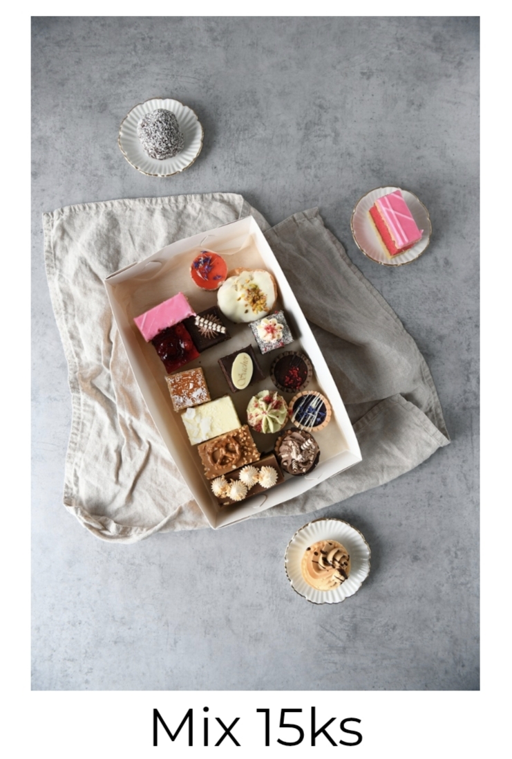 3x Kokosové raffy 3x Mini maková kocka3x Mini ovocná kocka 2x Mini pistáciový tart